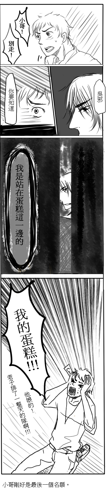 「吳邪,你跟來做什麼?其實你不應該被捲進來。你三叔已經為你做了不少事,你要知道──這裏頭的蛋糕,並不是讓你吃的。」